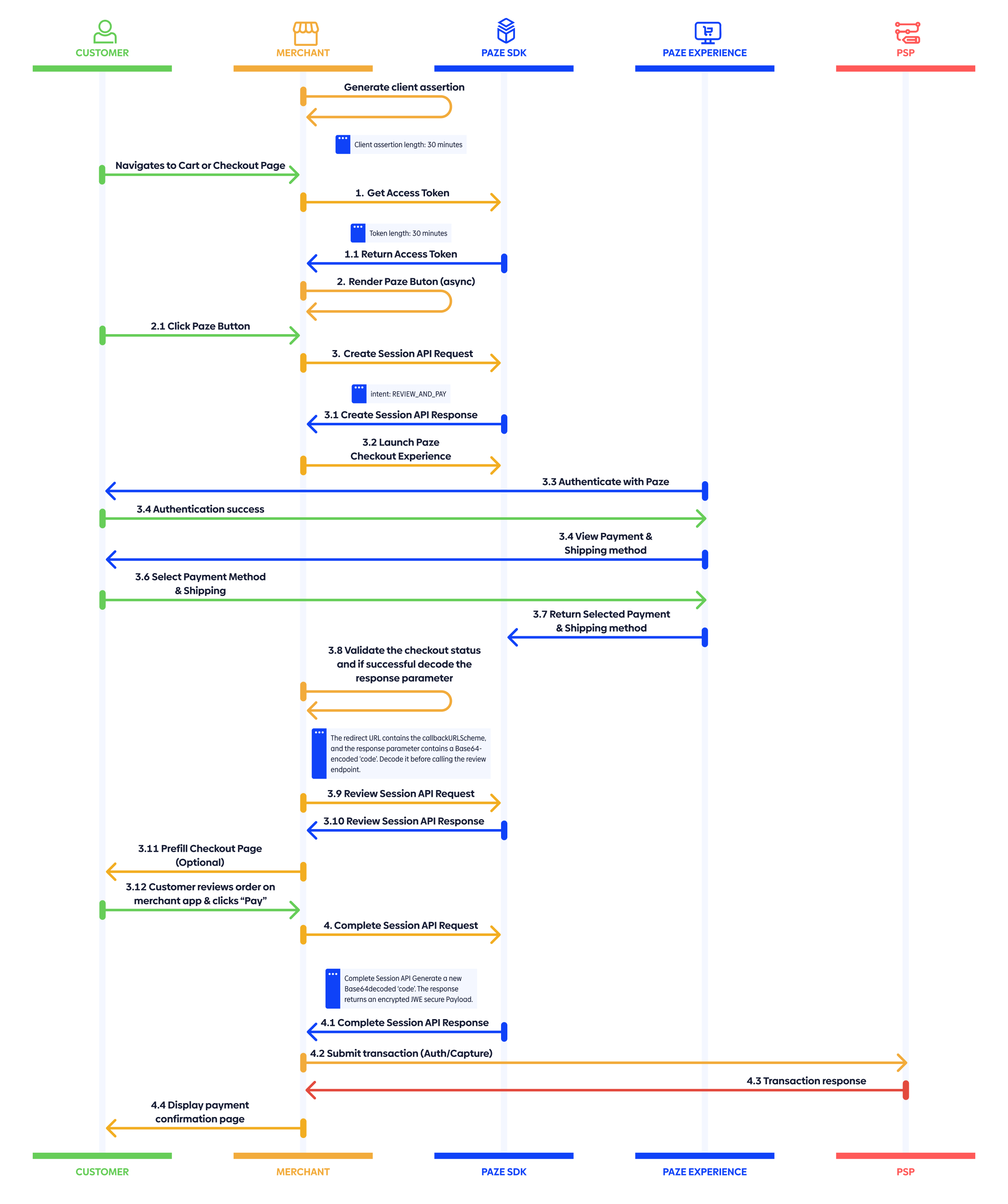 The following sequence diagram illustrates how the merchant site, Paze API, and Paze Experience interact during this process. It’s meant as a quick reference to understand the end-to-end flow before a deep dive into the sequence diagram and detailed integration steps.