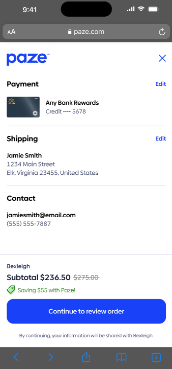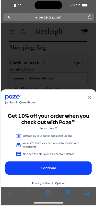Paze recognizes a consumer wallet by an email address or mobile phone number. However, the way in which a consumer’s email address or mobile phone number are collected is configurable based on a Merchant’s preference. In keeping with the Paze core principle of offering flexible implementation options, Merchants may choose to present the Paze experience differently depending on the consumer’s journey through the Merchant’s digital property.